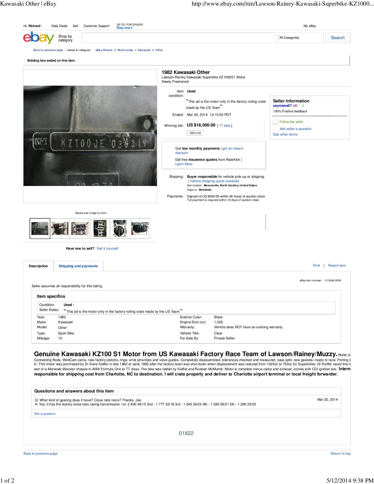 KZ1000S1 Motor #319 Sold for 18,000.00 USD (2014).